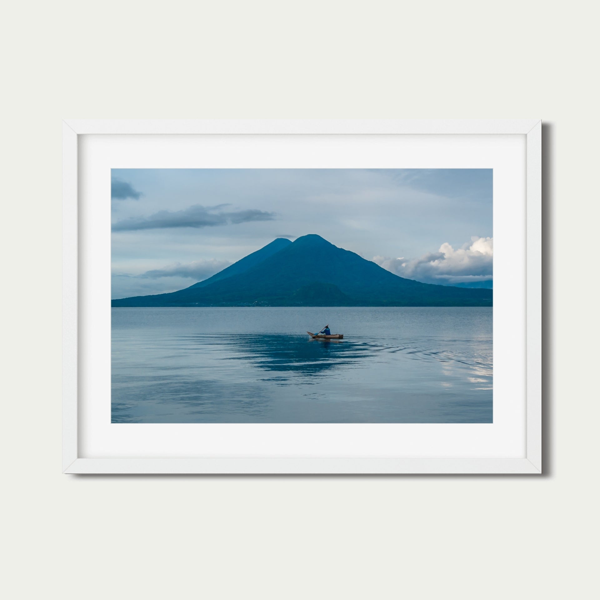 This serene wall art photograph captures a solitary fisherman rowing across the still waters of Lake Atitlán, Guatemala, with the imposing silhouette of the volcanoes in the background. The calm lake reflects the blue tones of the sky, creating a peaceful, minimalist composition. The contrast between the fisherman’s small boat and the grandness of the volcanoes evokes a sense of solitude and harmony with nature. Perfect for spaces seeking a touch of tranquility and the beauty of Guatemala's natural landscapes