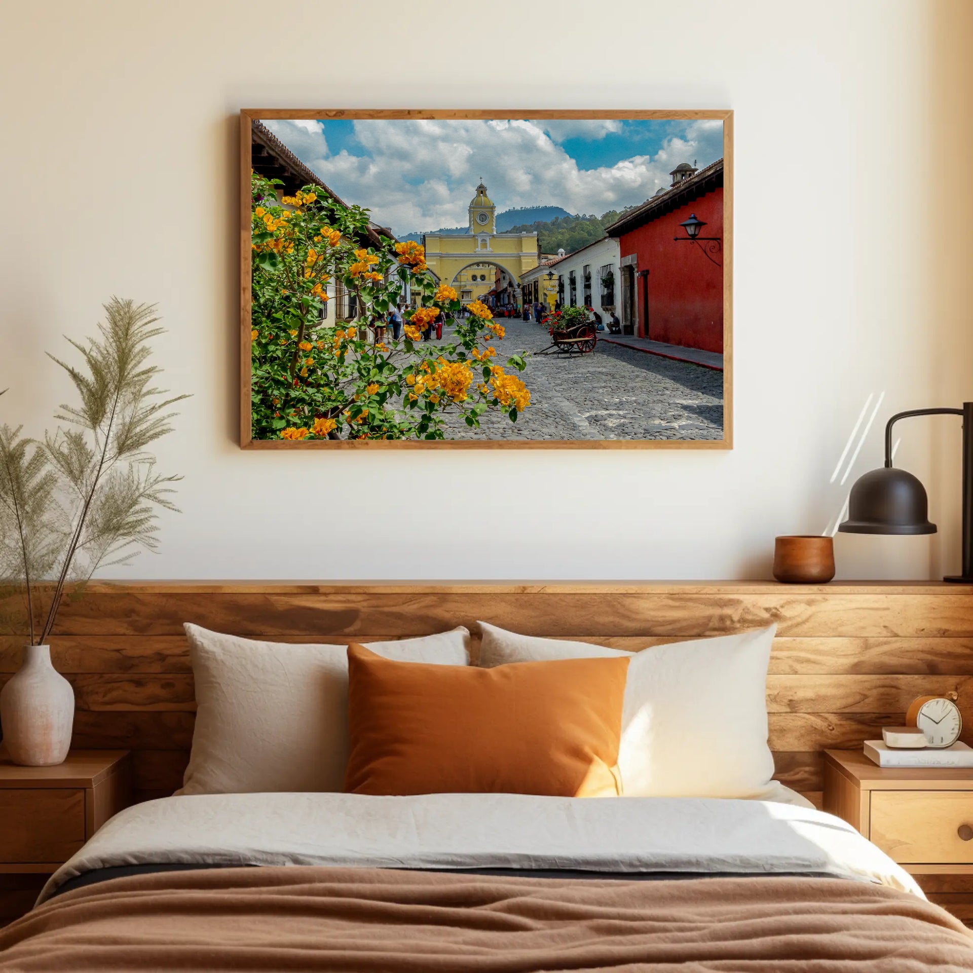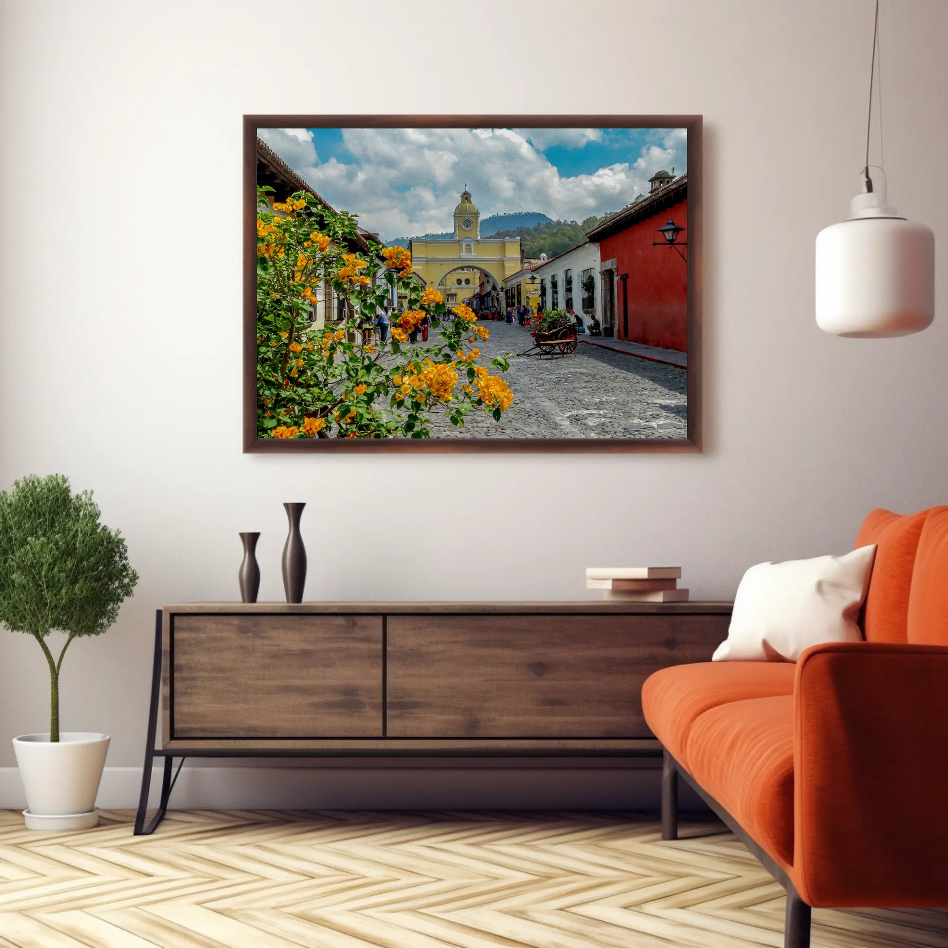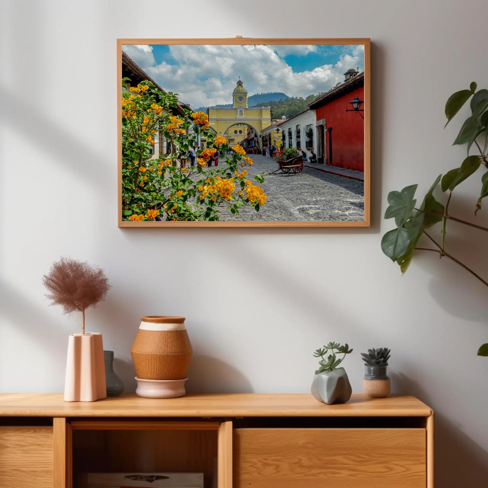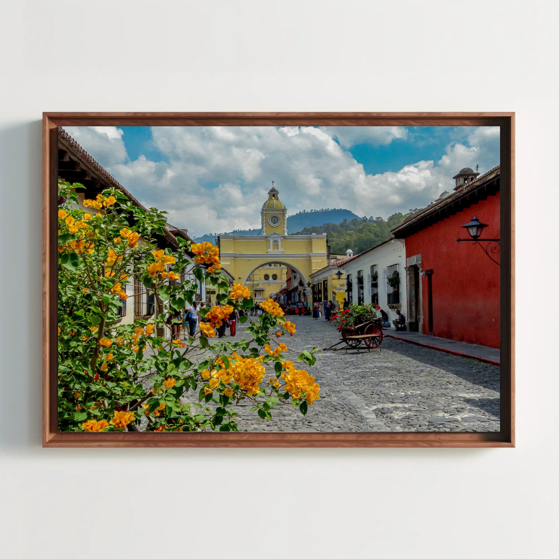 Set in the unique atmosphere of a Guatemalan morning, Colorful Antigua Guatemala captures the city’s enduring grace beneath an endless blue sky. The Santa Catalina Arch, timeless and elegant, stands as a sentinel over cobblestone streets that have carried centuries of history. A cascade of orange blossoms offers a vivid counterpoint to the rich colonial facades, evoking the warmth, vitality, and soul of this UNESCO World Heritage treasure.