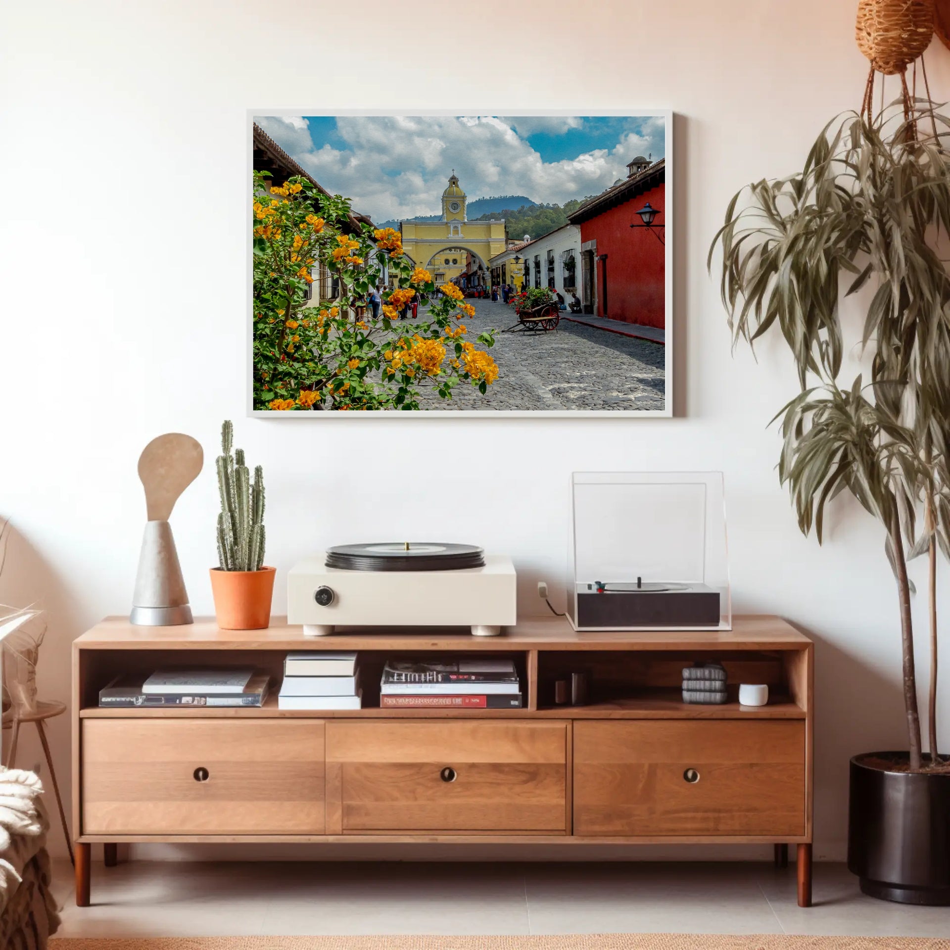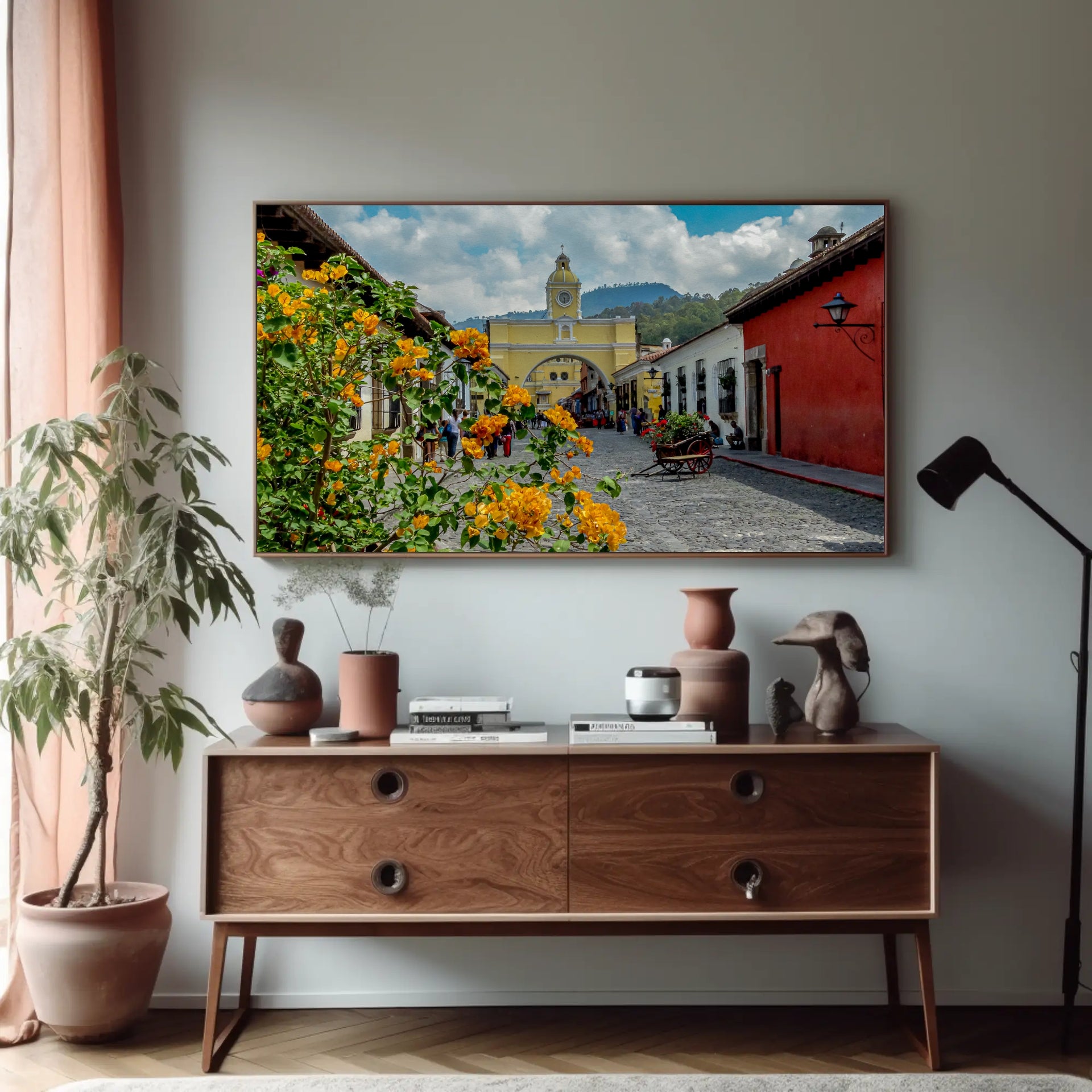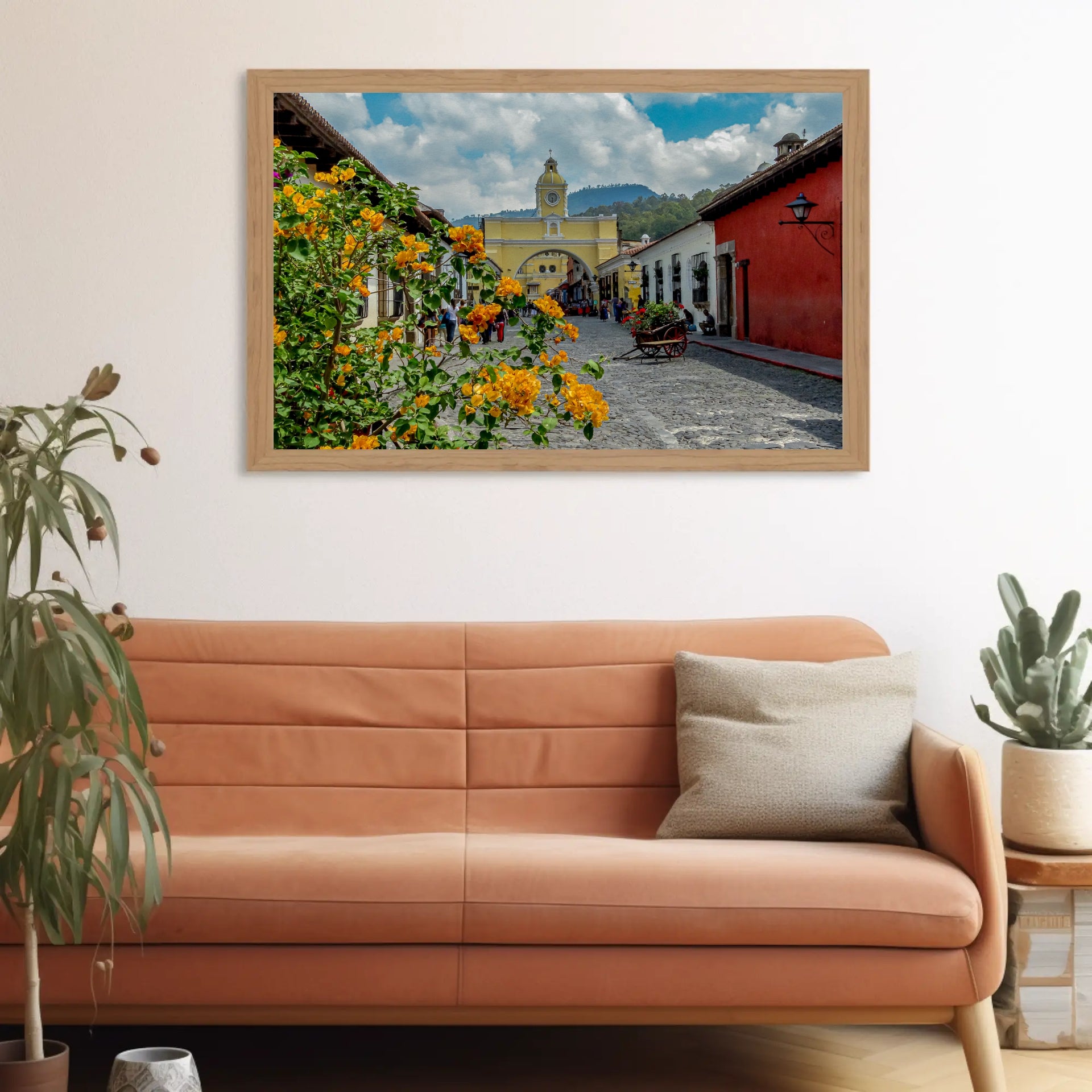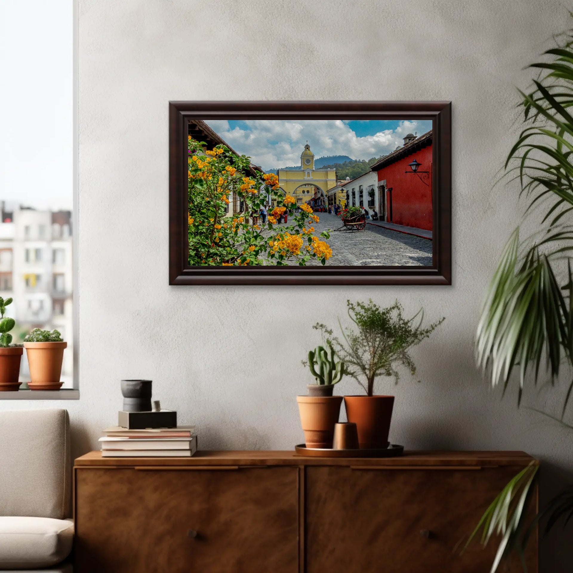 Set in the unique atmosphere of a Guatemalan morning, Colorful Antigua Guatemala captures the city’s enduring grace beneath an endless blue sky. The Santa Catalina Arch, timeless and elegant, stands as a sentinel over cobblestone streets that have carried centuries of history. A cascade of orange blossoms offers a vivid counterpoint to the rich colonial facades, evoking the warmth, vitality, and soul of this UNESCO World Heritage treasure.
