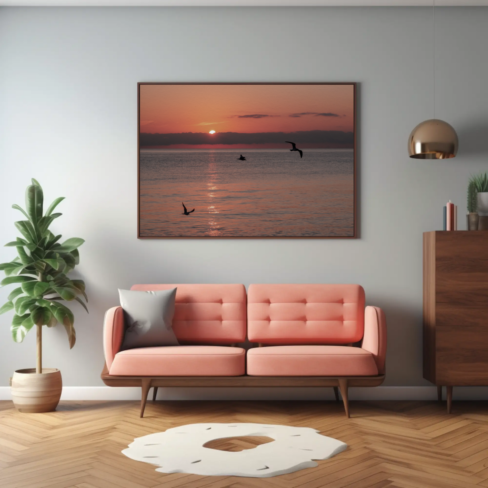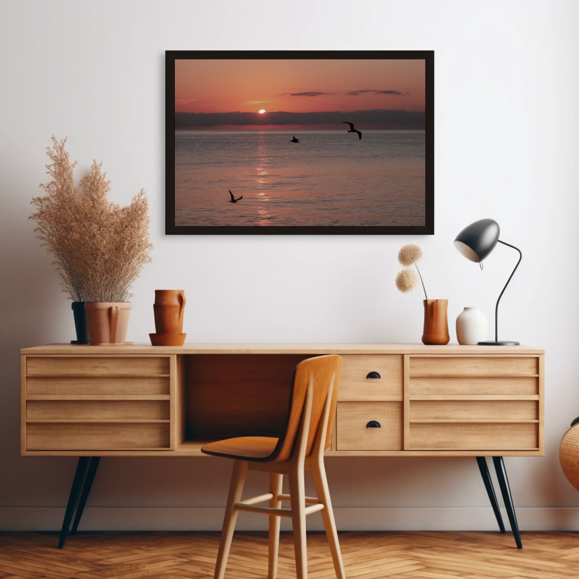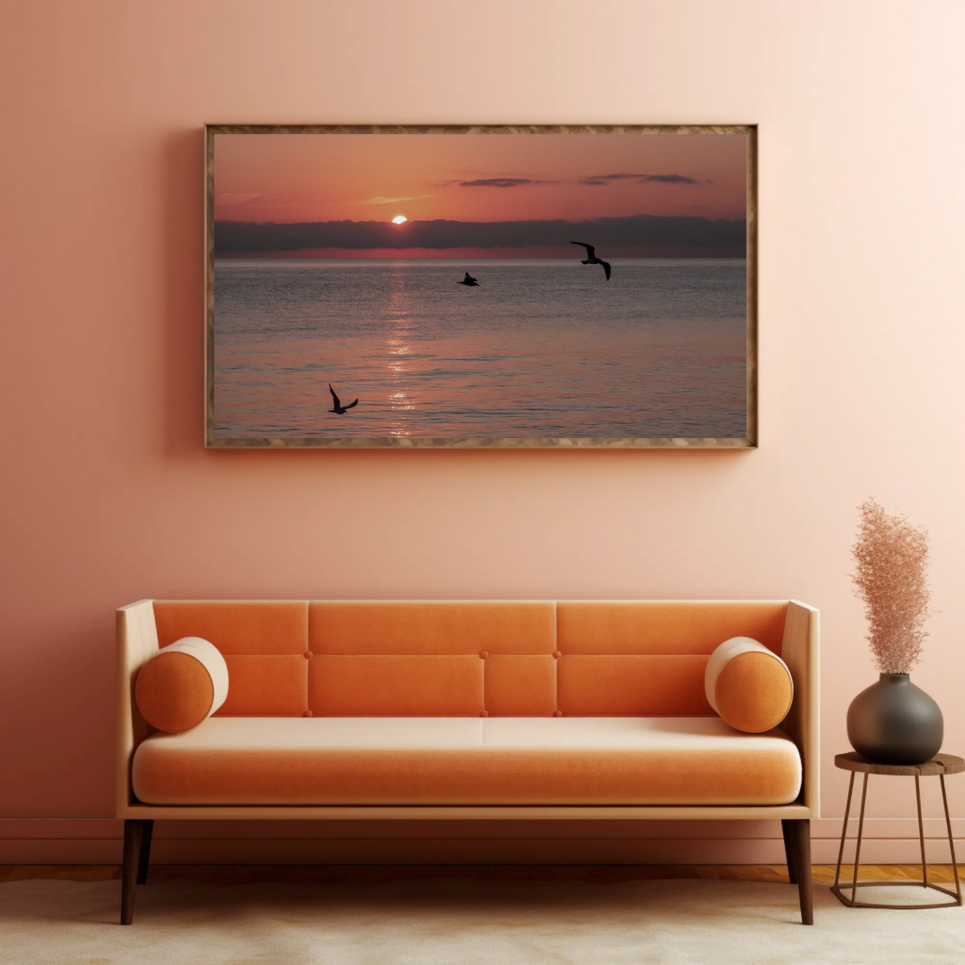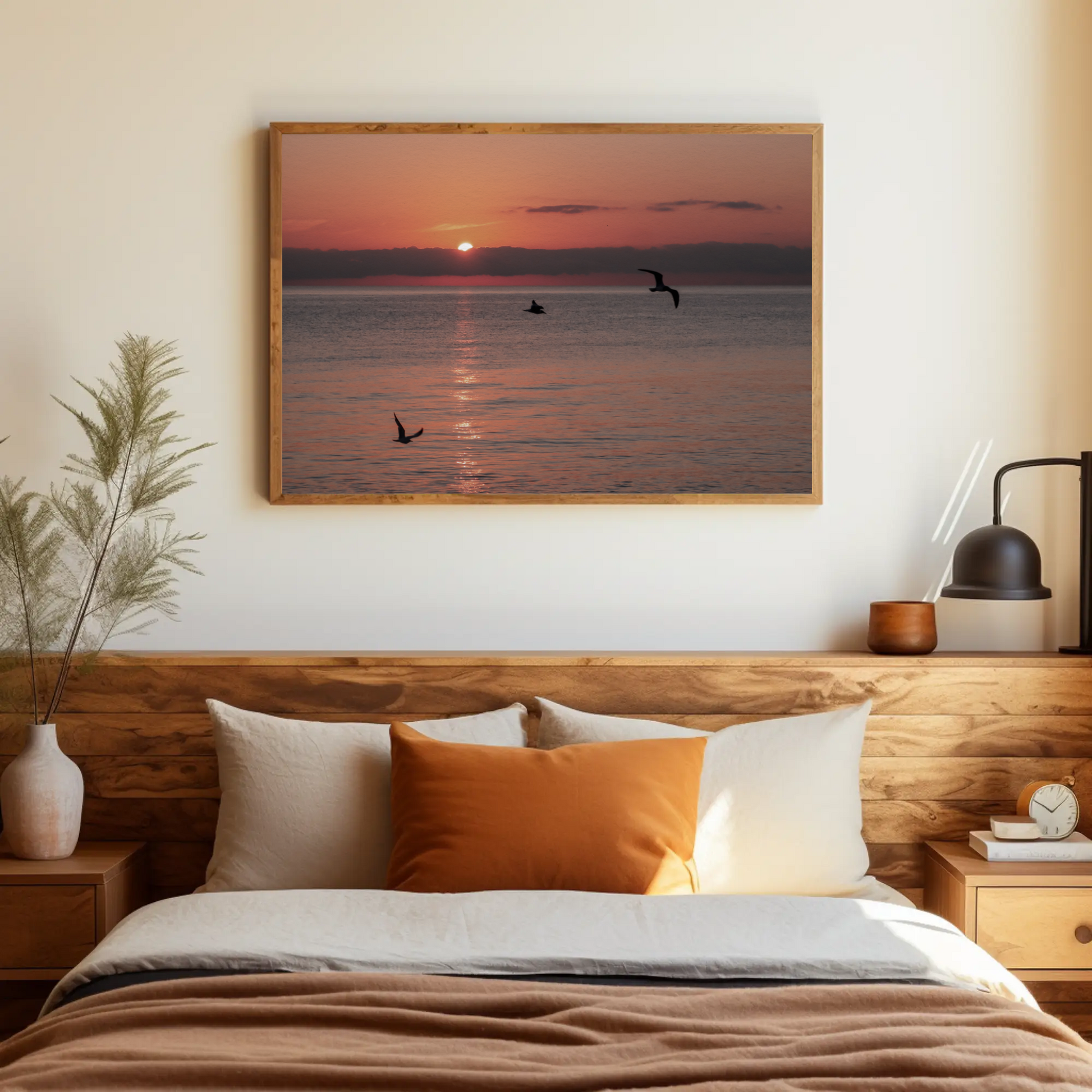 Captures the serene beauty of a Miami Beach sunrise, where the first light of the day pierces through the horizon. The sun peeks over a band of dark clouds, casting a soft glow across the calm waters, creating a rich gradient of warm hues — from deep orange to delicate pink. Silhouetted seagulls glide effortlessly through the sky, adding a dynamic touch to the stillness of the scene. This photograph evokes a sense of peace and wonder, a perfect moment where nature’s beauty is on full display, ideal for wall art that inspires tranquility and reflection.