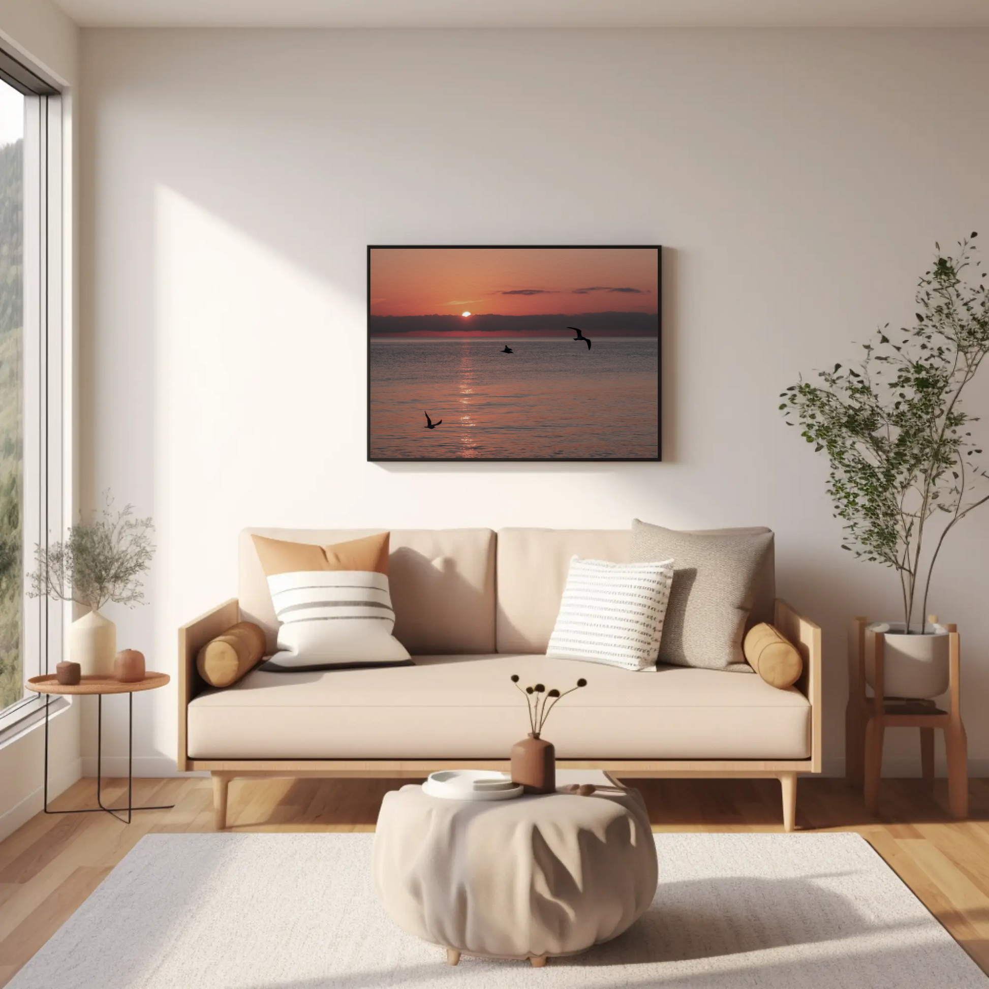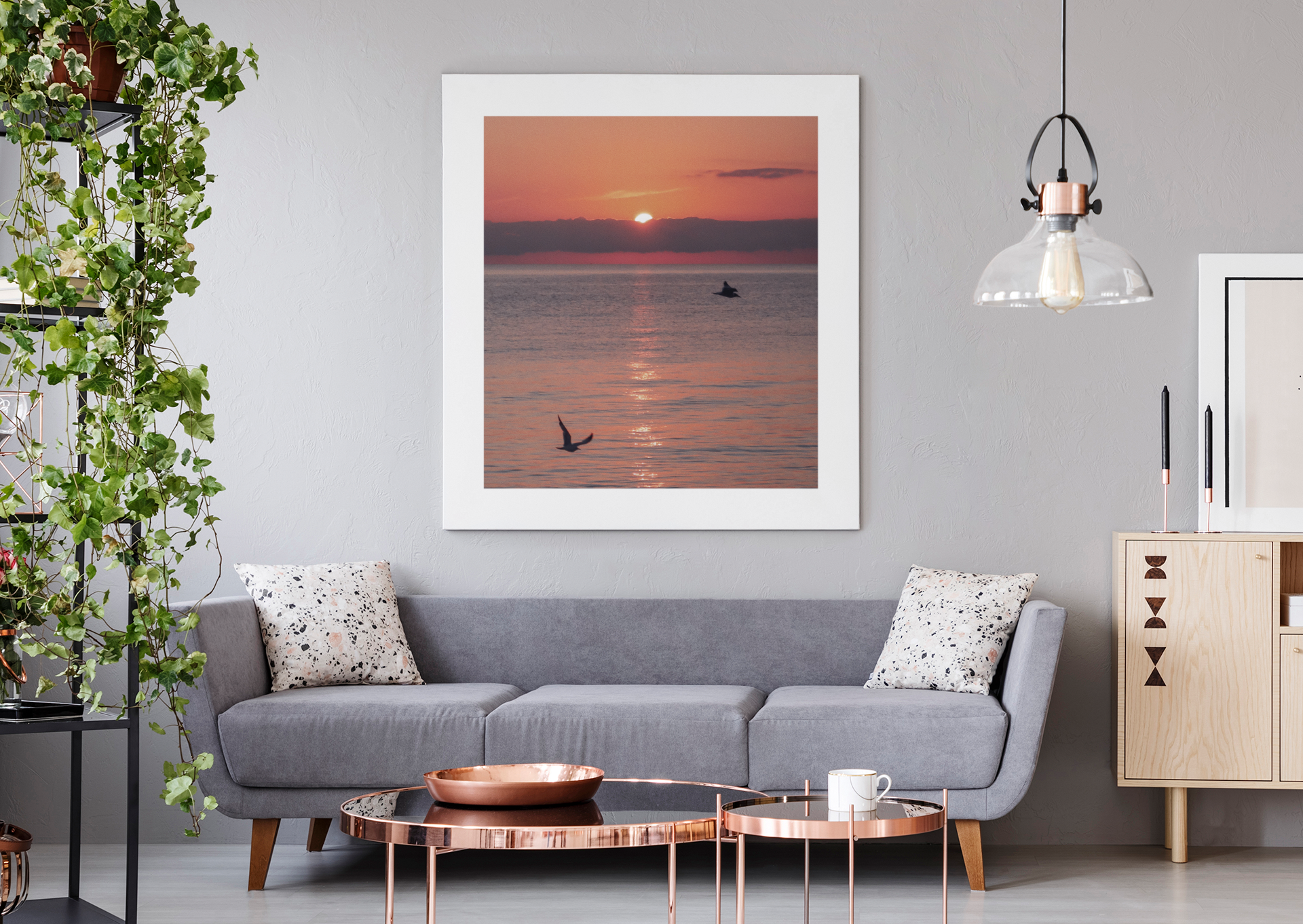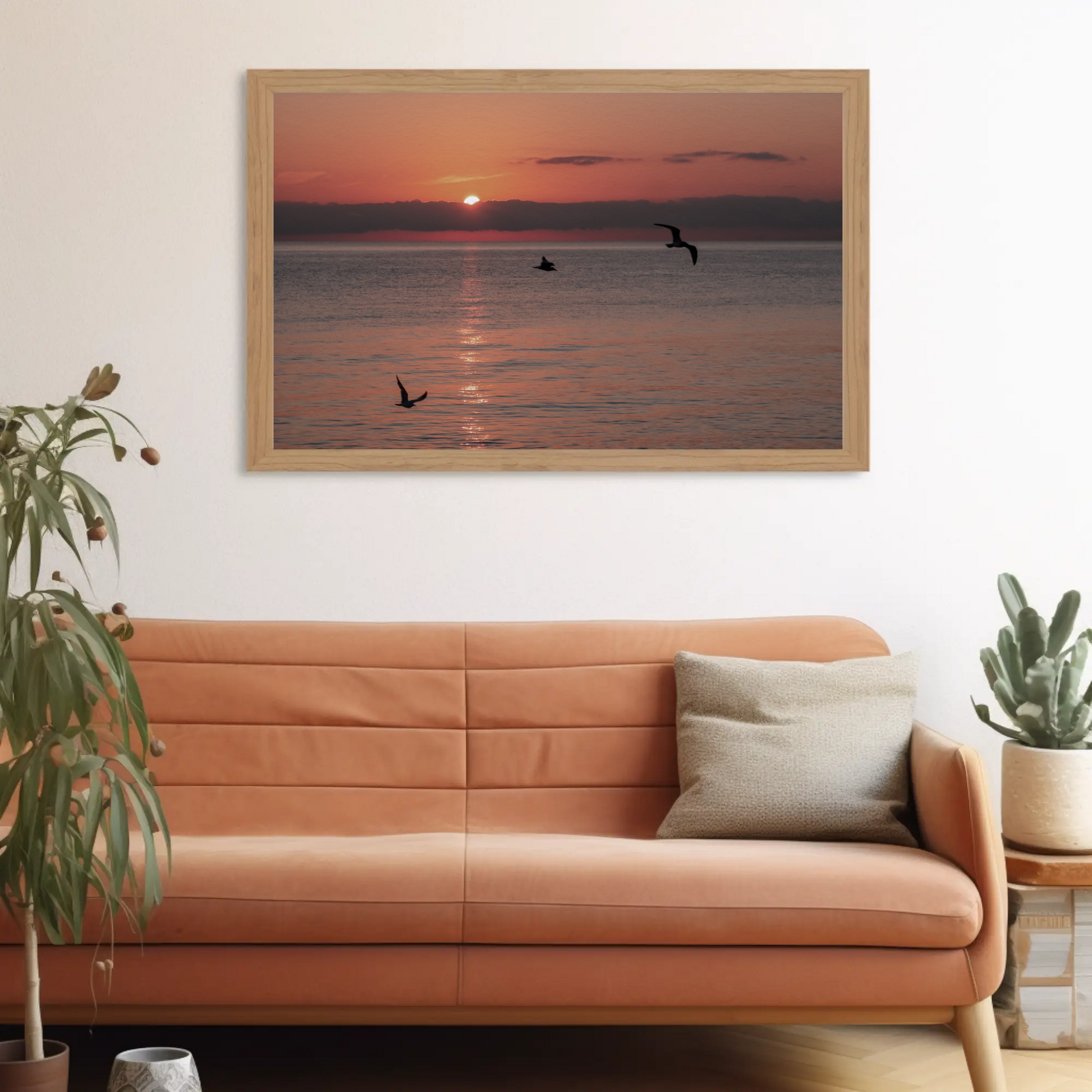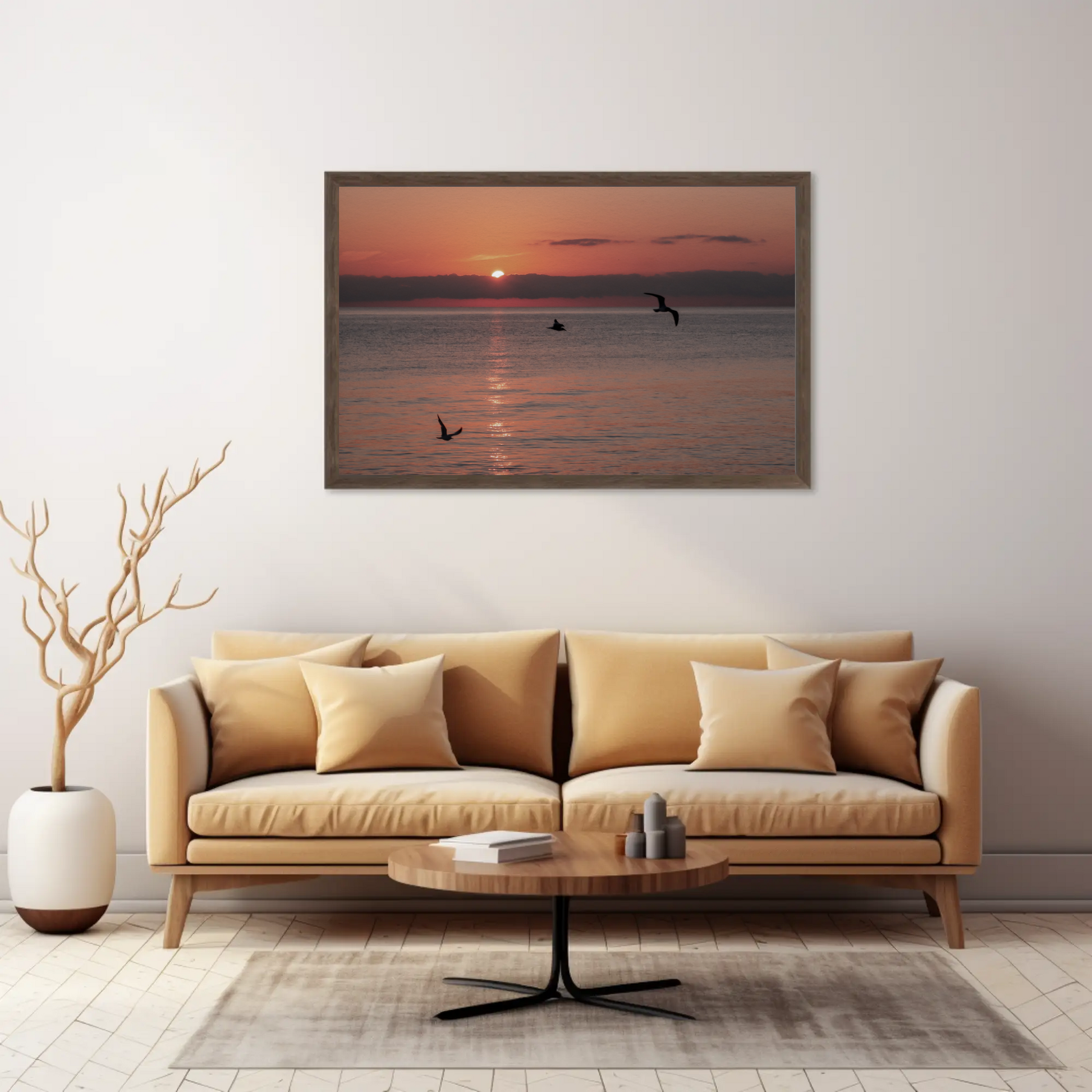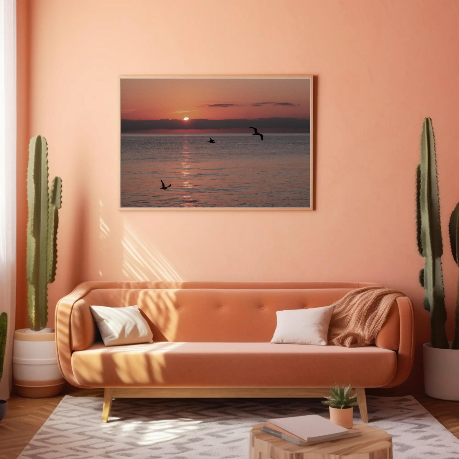 Captures the serene beauty of a Miami Beach sunrise, where the first light of the day pierces through the horizon. The sun peeks over a band of dark clouds, casting a soft glow across the calm waters, creating a rich gradient of warm hues — from deep orange to delicate pink. Silhouetted seagulls glide effortlessly through the sky, adding a dynamic touch to the stillness of the scene. This photograph evokes a sense of peace and wonder, a perfect moment where nature’s beauty is on full display, ideal for wall art that inspires tranquility and reflection.